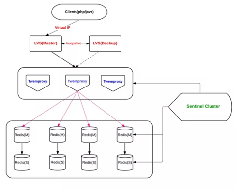 多个同构 Twemproxy(配置相同)同时工作,接受客户端的请求,根据 hash 算法,转发给对应的 Redis。