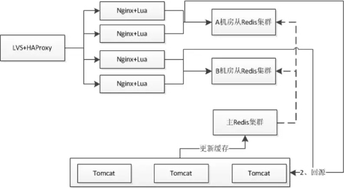 2)应用Nginx首先读取本地缓存;如果命中直接返回,不命中会读取分布式缓存、回源到Tomcat进行处理;