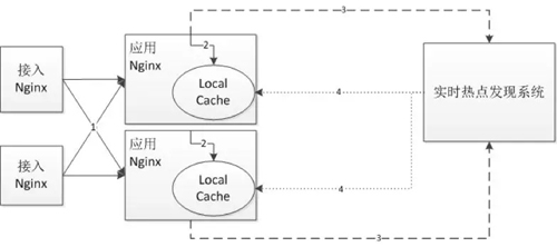 3)应用Nginx会将请求上报给实时热点发现系统,如使用UDP直接上报请求、或者将请求写到本地kafka、或者使用flume订阅本地nginx日志;上报给实时热点发现系统后,它将进行统计热点(可以考虑storm实时计算);