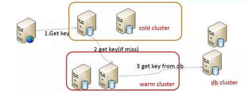 (2)数据预热配备回滚方案,遇到紧急回滚时便于操作。对于新建cache server集群,也可以通过数据预热模式来做一番手脚。如下图所示,先从冷集群中获取key,如果获取不到,则从热集群中获取。同时把获取到的key put到冷集群。如下图