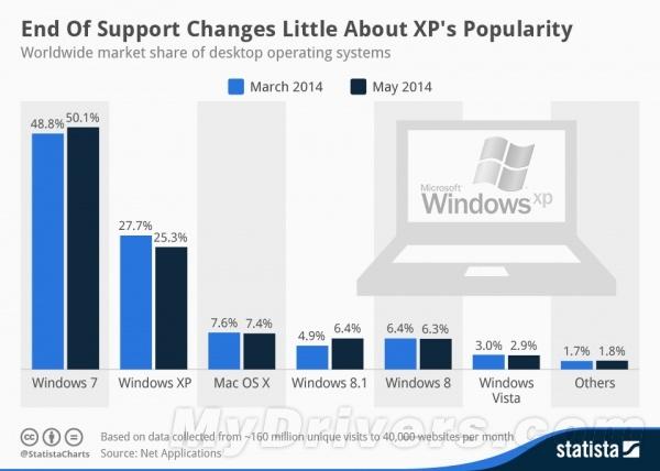 虽然微软已经正式停止了对Windows XP的支持,但根据权威市场调研机构Net Applications最新统计数据,从今年3月到5月,Windows XP在所有操作