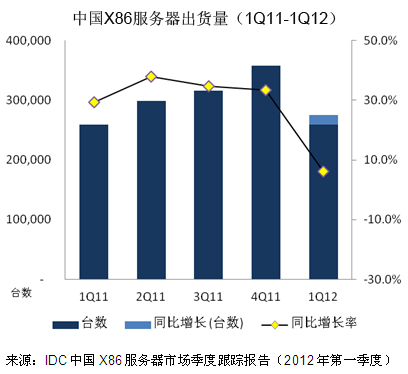 2012年7月18日,IDC关于中国X86服务器市场的最新研究显示,2012年第一季度中国X86服务器总出货量达到近27.5万台,和2011年第一季度相比增长6.2