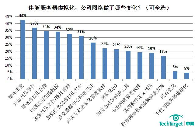 根据网络调查发现,为了服务器虚拟化,43%的公司增加带宽,37%的公司升级网络硬件,35%的公司进行网络虚拟化存储,34%的公司加强应用性能监控