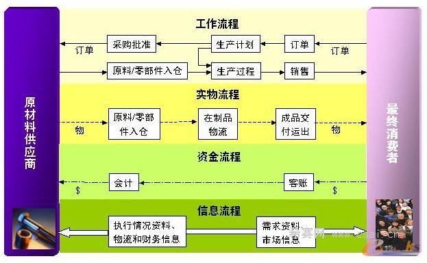 供应链的信息流程带动工作流程,工作流程决定实物流程,实物流程反馈为资金流程。