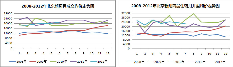 从2008-2012年北京新房月成交均价及新建商品住宅每月开盘均价走势可以看出,受调控政策影响导致价格方面有所波动,但纵观4年多来的整体走势,