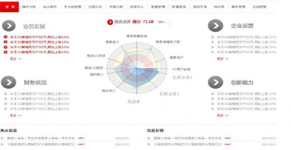 (上图为DW1.0设计的领导首页UI规范,这是一个工作台,包括:问题发现、任务指派和问题反馈三个功能。中间是对目前公司当月总体情况的评价结果,雷达图中显示综合评价指标池中业务发展、财务状况、企业运营、创新能力四类指标值与目标值的差距,并支持预警提示和问题的下钻探索。页面下方,是热点信息和信息反馈的连接,支持领导任务指派和问题反馈。)
