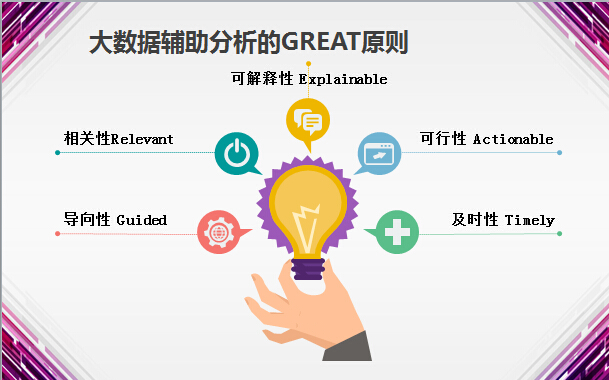 大数据技术基于海量一线数据,能让决策更科学,降低误判的风险。其中大数据辅助分析有一个称为GREAT的原则:Guided, Relevant, Explainable, Actionable, Timely,基于GREAT原则越来越多的企业将会用好大数据,发挥智囊团的作用。