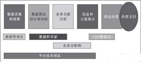 首先搜集数据,从不同地方把数据找到,找到以后选择算法。其次进行业务关联的分析,确定哪些指标、哪些维度是有意义的,这就是数据科学干的事。业务科学家和数据科学家可以分离,也可以整合,大部分企业是一套人马来做,展示成一个业务的可以接受、可以理解的方法,如果单纯是数据展示,可能管理层、业务部门看不懂,这就需要转换成业务管理者可以理解的语言和信息。最后,提交给管理层或者是对应的部门作商业决策。这就完成了一个完整的价值交付。