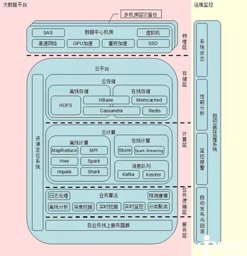 在软件层面上,第一层首先是云存储层。按时效性划分,各个大数据存储平台一般分为离线存储和在线存储两种类型。离线存储用来对超大规模数据(一般PB以上)进行持久性存储,适用于数据访问响应时间要求低(秒级以上)的场景。在主流平台里最典型的就是hadoop的HDFS。在线存储用来对海量数据进行实时的访问,适用于在线服务场景或者是对数据访问响应时间有高要求的计算任务提供支持的场景。在线存储不一定需要对数据进行持久化,同时它既可以是原始数据,也可以只是缓存的数据。在主流的平台里,Memcached是一个分布式内存缓存系统,不提供持久化。Redis与Memcached类似,但是它提供了持久化能力及主从同步能力,所支持的数据类型和操作更加丰富。以上两者是典型的缓存系统,在中等数据规模下表现较好,对于更大数据规模就会比较吃力,这时就需要使用HBase或者Cassandra等支持实时场景的大容量存储系统。同时,由于HBase和Cassandra支持超大规模数据的持久化存储,它们也可以用在离线存储领域。