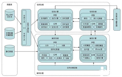 对于在线处理部分,在线计算平台所需的数据一部分来自从发布订阅系统中获取实时数据,另一部分来自在线存储系统。在线计算平台常见的计算类型有在线服务、流式计算、实时回馈等,分别服务于数据抓取、实时统计、实时监控、在线分析、实时推荐等应用。在线存储平台中的数据一般分为临时缓存数据和持久化数据,这些数据通常来自在线计算平台和离线计算平台。在线存储平台承载的应用有:KV缓存、数据库缓存、流式数据、字典服务等。