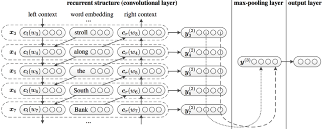如针对这句话”A sunset stroll along the South Bank affords an array of stunning vantage points”,stroll的表示包括c_l(stroll),pre_word2vec(stroll),c_r(stroll), c_l(stroll)编码A sunset的语义,而c_r(stroll)编码along the South Bank affords an array of stunning vantage points的信息,每一个词都如此处理,因此会避免普通cnn方法的上下文缺失的信息。