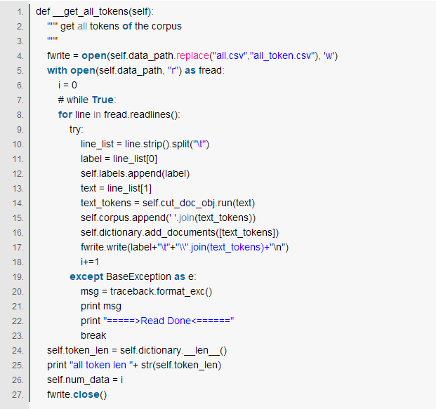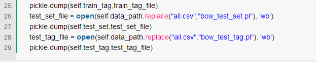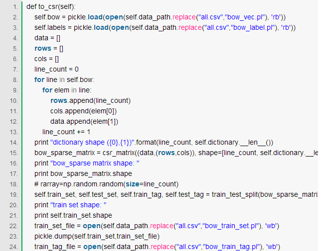 最终就得到每篇文章的bow的向量,由于这块的代码是在我的笔记本上运行的,直接跑占用内存太大,因为每一篇文章在token set中的表示是极其稀疏的,因此我们可以选择将其转为csr表示,然后进行模型训练,转为csr并保存中间结果代码如下: