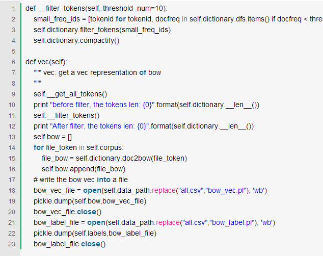 然后,tokens set 以频率阈值进行滤除,然后对每篇文章做处理来进行向量化: