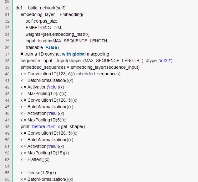 载入word2vec模型和构建cnn网络代码如下(增加了一些bn和dropout的手段):