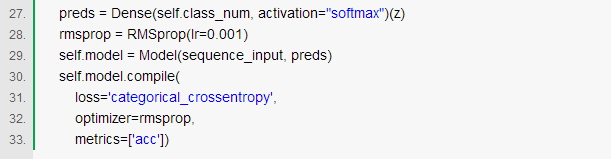 由于我这边的task是对文章进行分类,序列太长,直接接LSTM后直接爆内存,所以我在文章序列直接,接了两层Conv1D+MaxPool1D来提取维度较低的向量表示然后接入LSTM,网络结构代码如下: