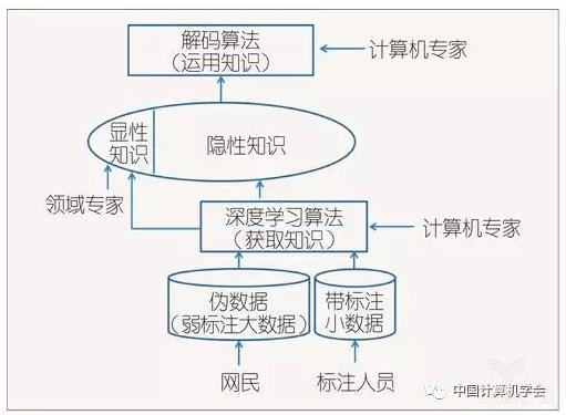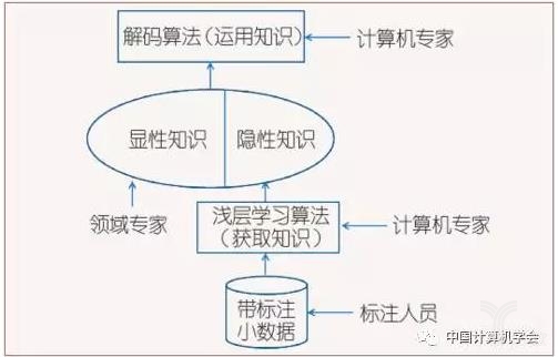 图1~4介绍了自然语言处理中知识获取方式演进的几个阶段。可以看到,真正的知识源是人。一共有三种人在提供知识:领域专家、标注人员和广大网民。其中标注人员包括专职的数据标注人员、兼职的学生,以及众包平台上的标注者。而计算机专家研制有关的算法,用算法从数据中获得隐性的知识。