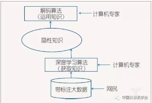深度学习“端到端”的方法兴起后,有些简单问题,如果能够找到足够多的大数据,则会按照图3的模式获取知识,即显性知识完全退场。深度学习系统几乎不需要领域专家提供的元知识,由机器自己确定特征,并分配各层的功能,尽管这些功能的划分是隐性的,难以解释的。