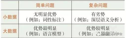 另一方面,深度学习需要大数据。深度学习不是万能的,在数据不足时,其效果将大打折扣。如表2所示,深度学习在获得大规模训练数据的简单问题上优势最明显。对于比较复杂的问题,例如机器翻译,如果有充足的双语对齐语料(如中英之间),则能取得较为明显的进展。这两年,神经网络机器翻译(NMT)已经迅速超越统计机器翻译(SMT)。但是,在人为定义的一些语言分析问题(如词性标注、深层语义分析)上,由于不可能获得充足的大数据,因而即便是针对简单问题,深度学习也没有明显超越传统方法,在复杂问题上甚至有劣势。因为问题复杂,而数据量不够时,学习工具越强大就越容易形成过拟合,所以效果自然不好。