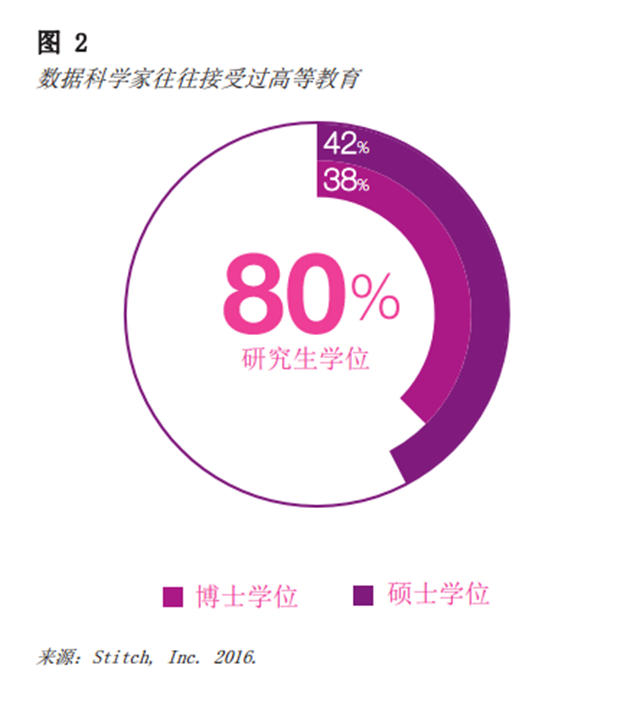 从根本上说,数据科学是一种扎根于强大学术背景的专业。高管应当寻找接受过定量研究学科(比如统计学、运筹学、机器学习、信息学、计量经济学或物理学)学术培训的候选人。一项对 LinkedIn 全球数据库的分析发现,80% 的数据科学家拥有研究生学位,其中 38% 获得博士研究生学位,42% 获得硕士研究生学位(见图 2)。