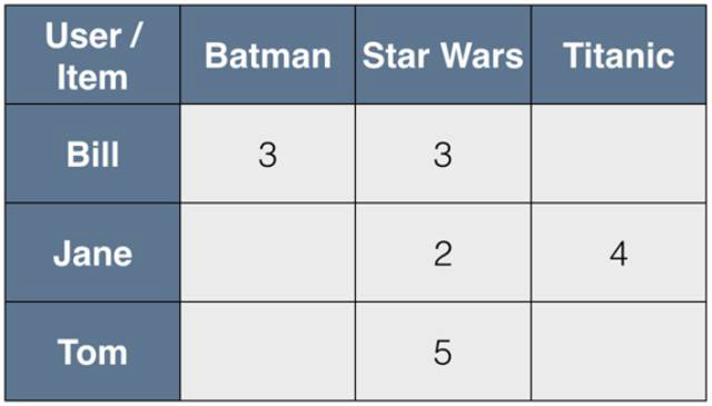 举个例子,如果我们想比较 Bill 和 Jane,我们知道的信息是 Bill 没有看过泰坦尼克号,Jane 没有看过蝙蝠侠,那么我们只能通过星战来衡量他们的相似度。怎么可能会有人不看星战,对吧?(微笑)