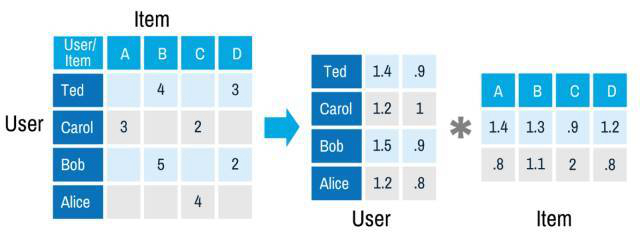 举个例子,矩阵分解后我们获得了 Ted 的向量(1.4;.9)和电影 A 的向量(1.4; .8),现在我们可以仅仅通过计算(1.4; .9)和(1.4; .8)的点积来还原电影 A-Ted 的评分,评分结果为 2.68。
