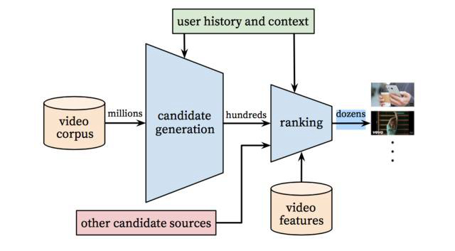 使用两阶段法(two-stage approach),我们就能够从很大的视频语料库中做出视频推荐,然而可以确信的是,这些推荐结果中只有少量是个性化的,而且是被用户真正进行应用的。这一设计也能使我们把其它资源生成的结果和这些候选结果混合在一起。