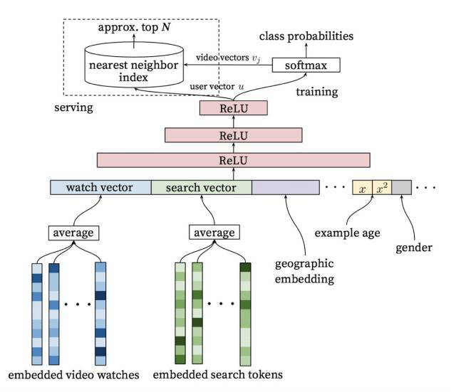 使用用户的历史作为输入,候选集生成网络(candidate generation network)显著地减少了视频的数量,并且可以从一个大型语料库中选取一组最相关的视频集。生成的候选集对用户来说是最为相关的,此神经网络的目的仅仅是为了通过协同过滤来提供一个宽泛的个性化服务。
