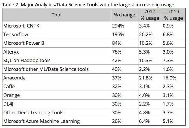 下表列出了在2017年里使用增长率超过20%且使用率至少达到2%的工具,这其中包括5个深度学习工具和4个Microsoft工具。