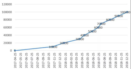 从这张图可以看出,从开通公众号到拥有第一个一万用户用了将近六个多月,2017年底的时候关注用户量也才16666个,自从2018年3月之后公号的关注读者才呈现了飞速上涨的趋势,这也印证了互联网行业的特点:越小越弱越大越容易发展。