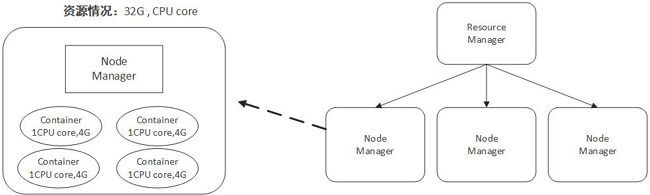如上所示,Yarn 将CPU核数,内存这些计算资源都封装成为一个个的容器(Container)。需要注意两点: