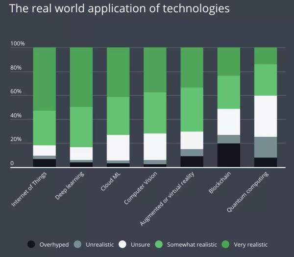 这些新技术,到底哪个在开发者心目中是最接近现实,目前看来最容易落地的呢。经过调查,IoT以53%占比获得第一名、量子计算排名最后,区块链倒数第二。