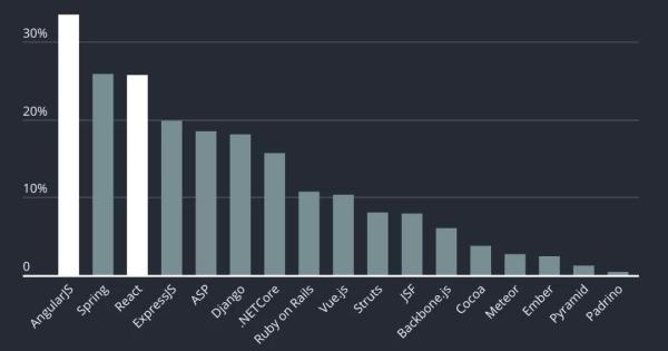 2018年,最闻名的开发框架是AngularJS、其次是Spring。