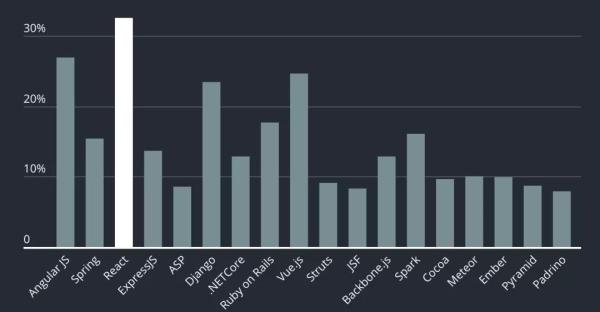 2019年,开发者最想学习的框架是React,Java系的Spring排名第七。