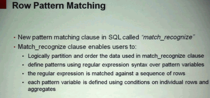 5.行模式匹配:类似分析函数的功能,可以在行间进行匹配判断并进行计算。在SQL中新的模式匹配语句是“match_recognize”。
