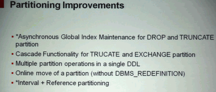 6.分区改进:Oracle Database 12c中对分区功能做了较多的调整,Oracle ACE总监杨廷琨花了较大的篇幅对分区提升进行了解读,其中共分成6个部分: