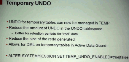 9.临时UNDO:将临时段的UNDO独立出来,放到TEMP表空间中,优点包括:减少UNDO产生的数量;减少REDO产生的数量;在ACTIVE DATA GUARD上允许对临时表进行DML操作。