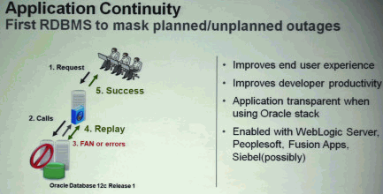 [page] 11.应用连续性:Oracle Database 12c之前RAC的FAILOVER只做到SESSION和SELECT级别,对于DML操作无能为力,当设置为SESSION,进行到一半的DML自动回滚;而对于SELECT,虽然FAILOVER可以不中断查询,但是对于DML的问题更甚之,必要要手工回滚。而Oracle Database 12c中Oracle终于支持事务的FAILOVER。