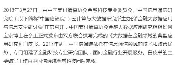 2018年3月27日,中国支付清算协会金融金融大数据研究组组长正式发布《大数据在金融领域的典型应用研究》。