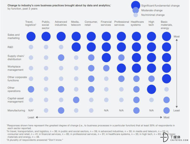 在McKinsey 2018年1月的研究报告 “Analytics Comes of Age”中,以大数据分析为代表的高级分析技术对于销售与营销、研究与开发(R&D)、包