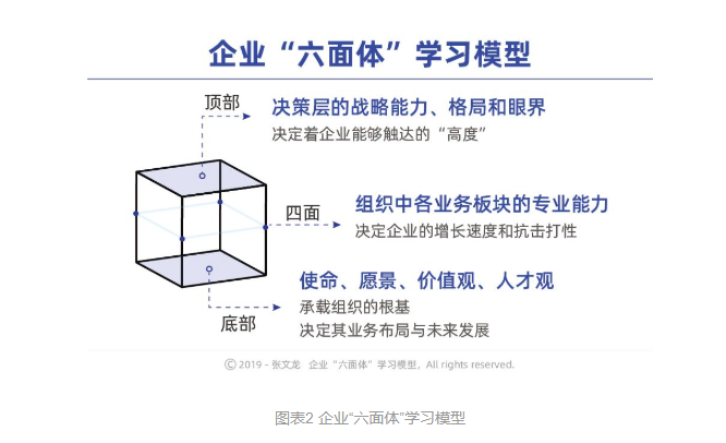 其二,组织学习觉醒已成必然。笔者在2018年提出企业“六面体”学习模型(见图表2)——将组织形容为一个立方体,底部为使命、愿景、价值观、人才观等承载组织的根基,决定其业务布局与未来发展;顶部代表决策层的战略能力、格局和眼界,决定着企业能够触达的“高度”;四面是组织中各业务板块的专业能力,决定了企业的增长速度和抗击打性。