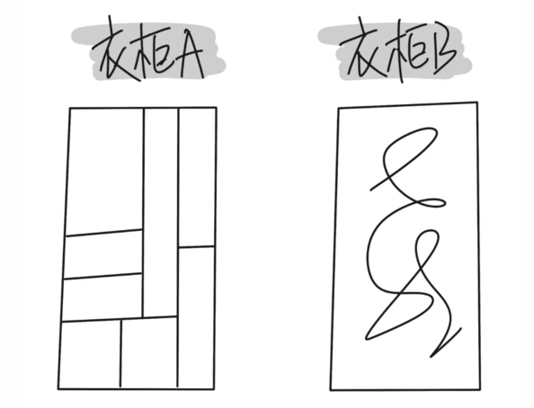 有隔层的衣柜A衣服按照季节和材质进行了分类,每一类占用一个格子,看起来井然有序;无隔层的衣柜B衣服堆积如山,看着满满当当的。