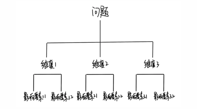 这里需要提醒一点:每一个问题都可以有N个评估维度,每个评估维度下又会有N个关联影响要素。这里的N不是无穷尽的意思,而是“未知”,根据不同的问题可拆解的层级不同。