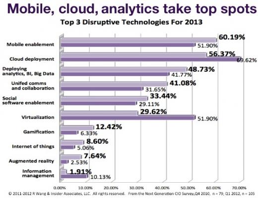 市场研究公司的调查结果显示了一些有趣的信息。调查显示,CIO们对云计算和虚拟化的关注度下降,移动支持关注度居首。