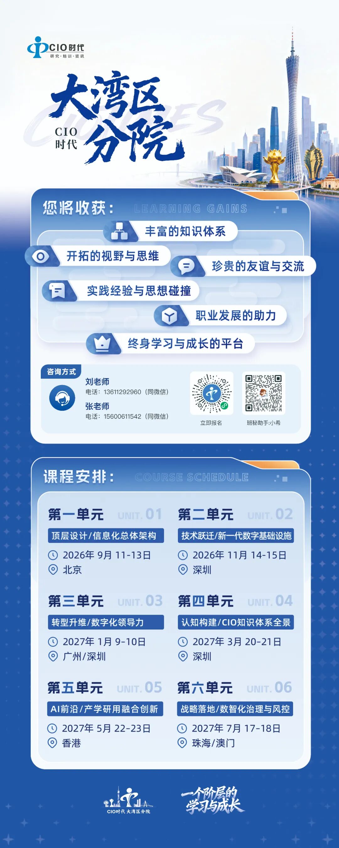 CIO 时代大湾区分院华南 CIO 班——汇聚资源、国际认证体系与行业智库力量,联合港澳高校与头部企业,致力于培养“懂技术、懂业务、懂管理、懂湾区、懂国际”的复合型数字领袖。在这里,你将与同行者共同探索数字化转型的核心逻辑,挖掘湾区产业数智化的独特路径,为企业突破增长瓶颈、实现高质量发展注入强劲动力!