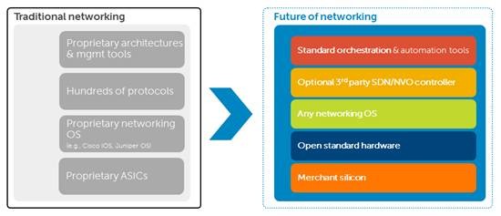 戴尔通过使用开放网络安装环境能够使网络硬件支持不同的操作系统。这使得网络操作系统能无缝安装至开放网络交换机中。除了开放标准硬件,戴尔志在打造一个完整的开放网络生态系统,包括多种操作系统如戴尔OS9、Cumulus Linux OS、Big Switch Light OS、IP OcNOS以及Pluribus Netvisor OS。这为用户挑选适合其环境的操作系统带来多种选择,同时也给用户选择控制器和编制工具带来更多灵活性。