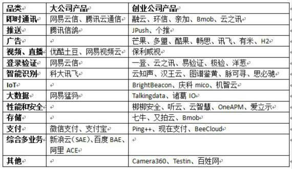 从表格中可以看出,目前国内的PaaS模式云计算创业公司众多,巨头只选择了即时通讯、推送、视频、支付等少数热门领域作为试水,尚未完全切入。而国内PaaS市场之所以弱小,和巨头们的迟迟发力有很大关系。