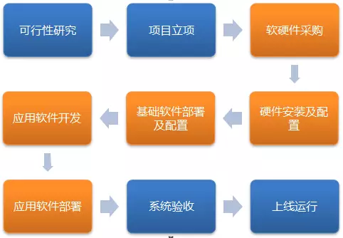 第二,由于云平台通过自动化技术完成了硬件设备和基础软件的部署和配置,业务系统的实施过程中不再需要部署和配置硬件设备和基础软件了,只需要在申请的云服务(虚拟机服务、存储服务、中间间云服务等)基础上部署和配置业务系统的专有软件。所以上述的“硬件安装及配置”和“基础软件部署及配置”两个环节可以省掉。
