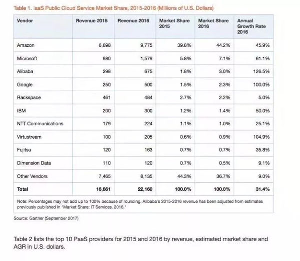 2015年至2016年IaaS公有云服务市场份额(单位:百万美元):