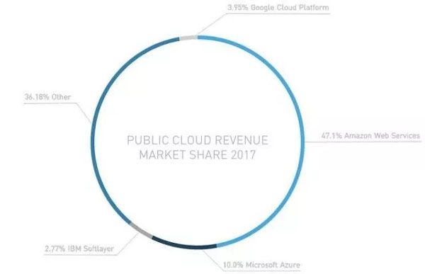 根据Gartner 2017年的调研,亚马逊云(AWS)和微软云(Azure)是公有云市场两大主要玩家,分别占47.1%和10%的市场份额,紧跟其后的是谷歌云(3.95%)和IBM Softlayer(2.77%)。