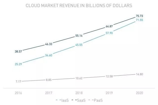 如果IaaS的这个增长率一直保持到2021年,它可能会在下一个十年的某个时候,超过软件即服务(SaaS),成为云行业的第二大板块,仅次于云广告。预计SaaS行业会增长20.1%,到2017年年底达到463亿美元。据Gartner的同一份报告声称,预计SaaS到2021年会增加到757.3亿美元,CAGR达到18.4%。